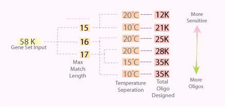 Oligo sets can be designed with different strigency by varying the maximum match length and minimum temperature separation parameters of Picky. Generally, a bigger oligo set can be produced when the maximum match is increased, or when the minimum temperature is descreased. However, making those changes also decreased the discriminative power of the oligo designed. Therefore, it is up to the users to decide which oligo set gives them the best balance between number of oligos and the discriminative power. A picture is provided below to illustrate the difference:
